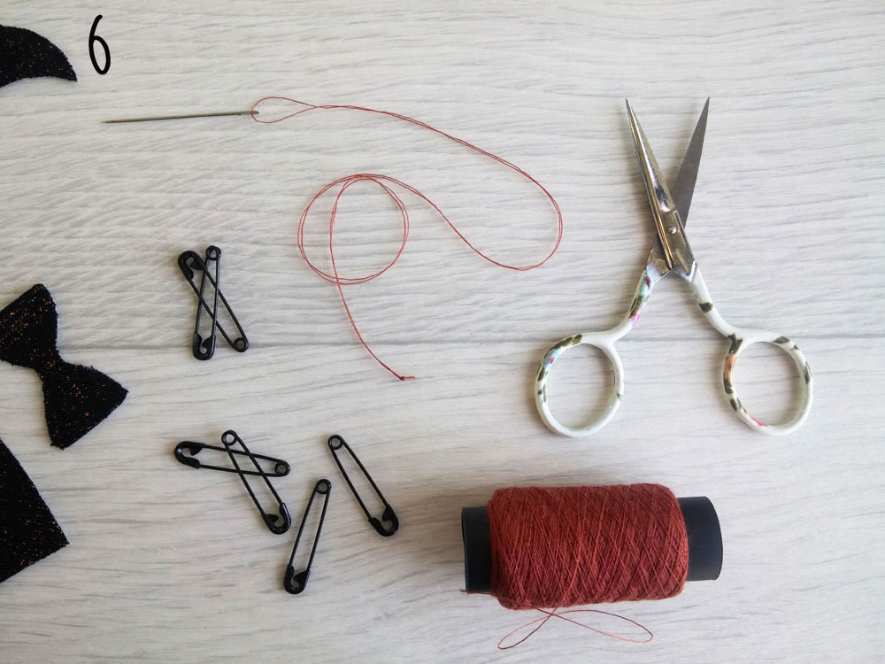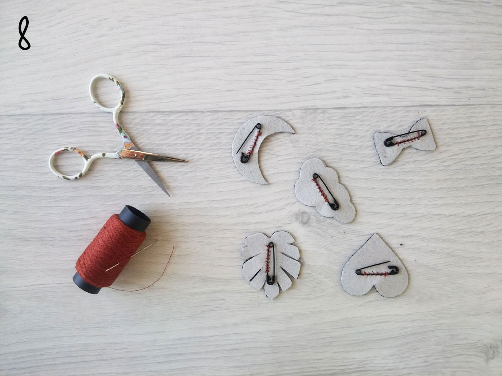 4 – Avec un fil double (photo 6), coudre une épingle de sûreté au dos de chacune des broches à l’aide de petits points tout au long de la tige (photo 7 et 8). Vous pouvez ouvrir votre épingle au préalable afin d’être certaine de bien coudre le bon côté de l’épingle ! 😉
