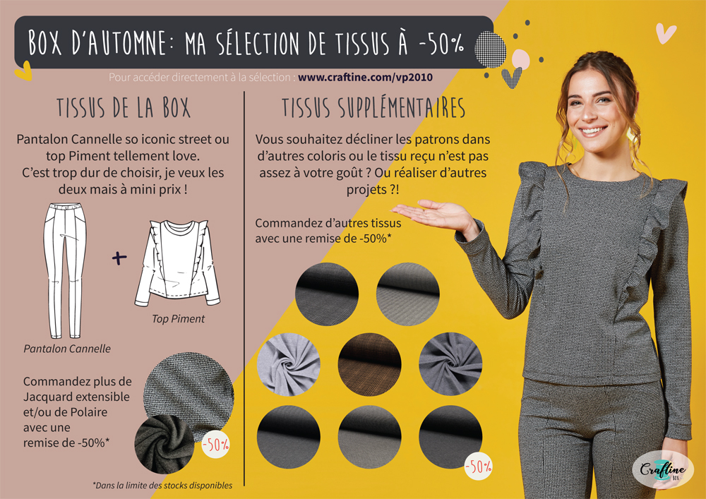 L’automne est là et la nouvelle Craftine box aussi, de quoi vous concocter une tenue au top pour la saison. C’est une box qui déborde avec de magnifiques matières et un motif tendance intemporel ! Du graphisme, du relief, du chic, du street, du love, voici une nouvelle box qui va vous faire fondre de plaisir.