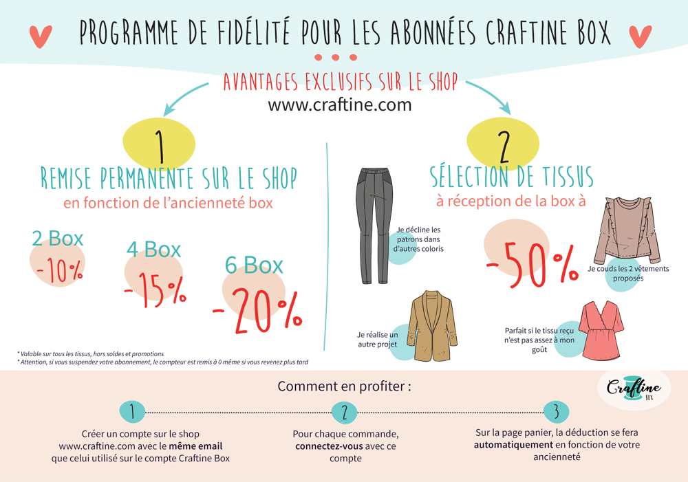 Si votre abonnement est actif et que vous vous connectez avec votre compte Craftine Shop, une remise de 50% va être appliquée automatiquement à tous les tissus de la sélection. Si vous n’avez pas encore de compte Craftine Shop, créez-en un avec le même email que celui utilisé pour Craftine Box.