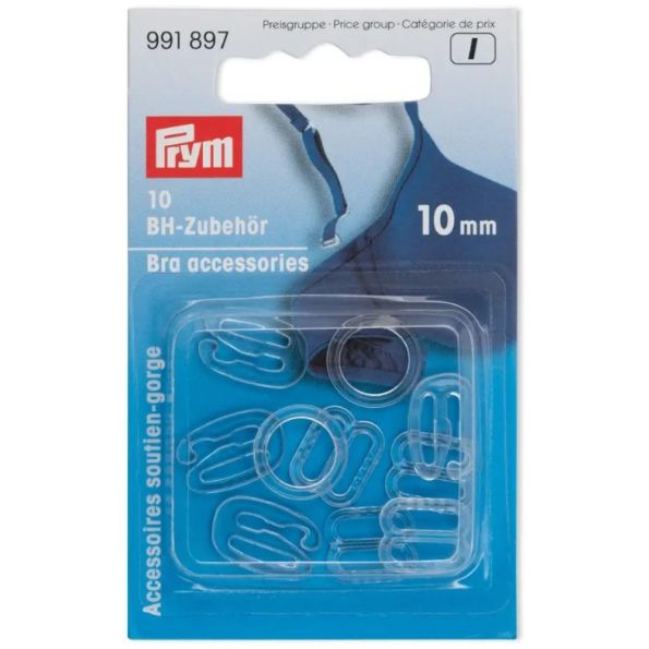 Ces accessoires de soutien-gorge transparents Prym composés de 10 pièces comprennent 4 arrêts, 2 anneaux et 4 fermoirs en plastique pour remplacer les pièces usées ou pour la fabrication de soutiens-gorge cousus à la main. Avec les anneaux et les arrêts, les bretelles sont reliées aux bonnets selon le modèle du soutien-gorge. Les fermoirs sont utilisés pour ajuster à l’avant et à l'arrière la longueur des bretelles. Toutes les pièces sont en plastique robuste.