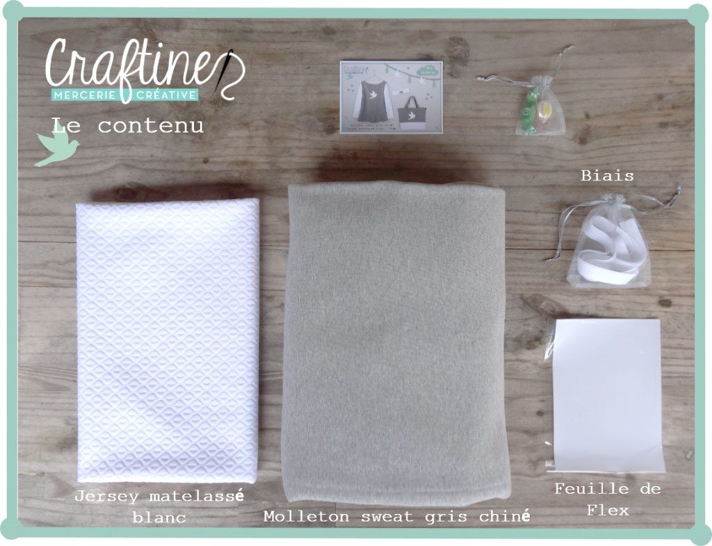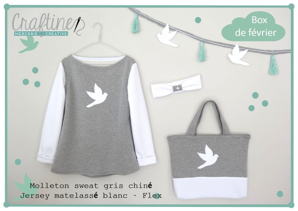 La voici, ce mois-ci la Craftine box est en mode cocooning, nous avons choisi de vous chouchouter tout en douceur et en tendresse pour finir agréablement l’hiver et mettre un pied dans le printemps. Le blanc et le gris chiné sont à l’honneur, renouveau et brillance. La douceur de cette box en fait une box bien garnie car nous avons sélectionné des tissus moelleux et épais.