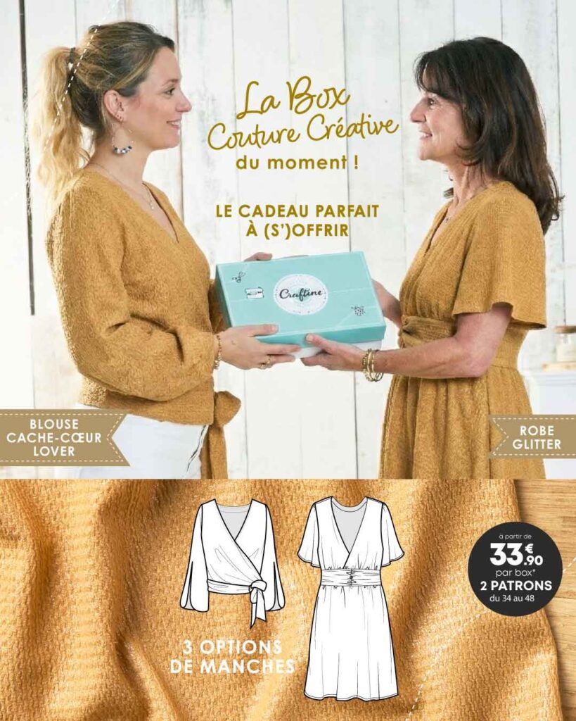 On vous propose 2 nouveaux patrons couture inédits : La robe Glitter et la blouse cache-coeur Lover. Sur le flyer de la box, vous avez la possibilité de découvrir les premières créations d’abonnées. Cela vous permettra de vous projeter plus facilement !