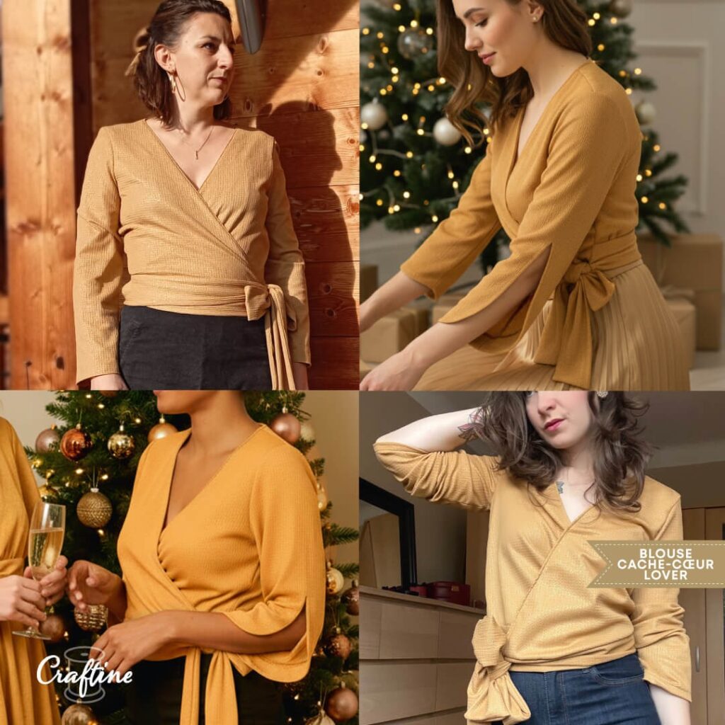 ✨Pour un look féminin et élégant, optez pour la blouse cache-cœur. Son effet drapé et son grand nœud à la taille subliment la silhouette. La forme croisée crée un joli décolleté en V, parfait pour toutes les morphologies. Sa coupe se marie idéalement avec une jupe ou un pantalon taille haute pour une allure moderne. Et le détail waouh : ses options de manches longues droites, fendues ou papillon. Son tissu miel pailleté d’or apporte une touche festive et raffinée.