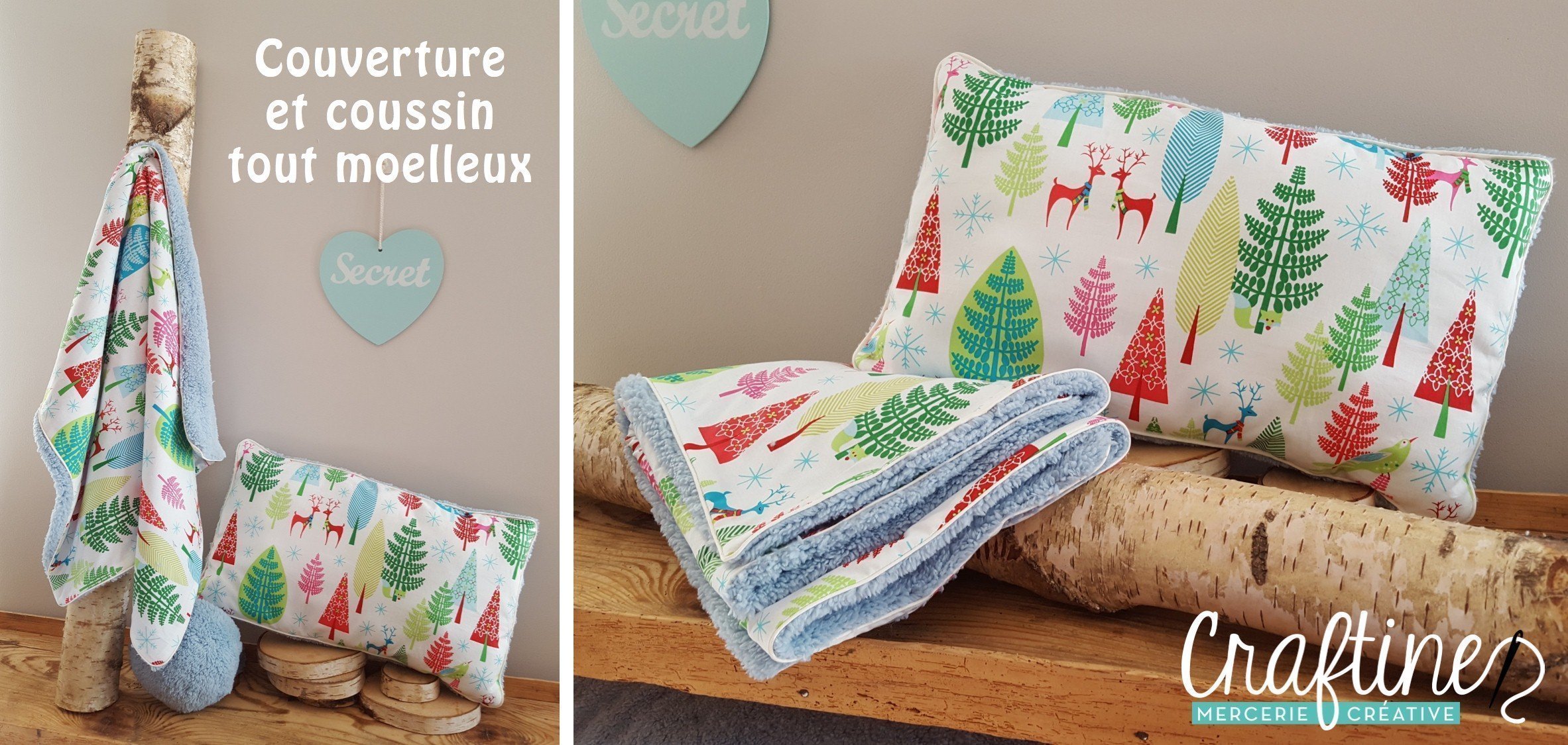 Voici un joli ensemble composé d’une couverture et d’un coussin tout doux, tout moelleux qui va tenir bien au chaud votre bébé ou votre enfant ! Vous pouvez également le décliner pour vous. La couverture et le coussin se composent d’une face en coton imprimé et d’une face en fausse fourrure mouton, le tout agrémenté d’un passepoil assorti.
