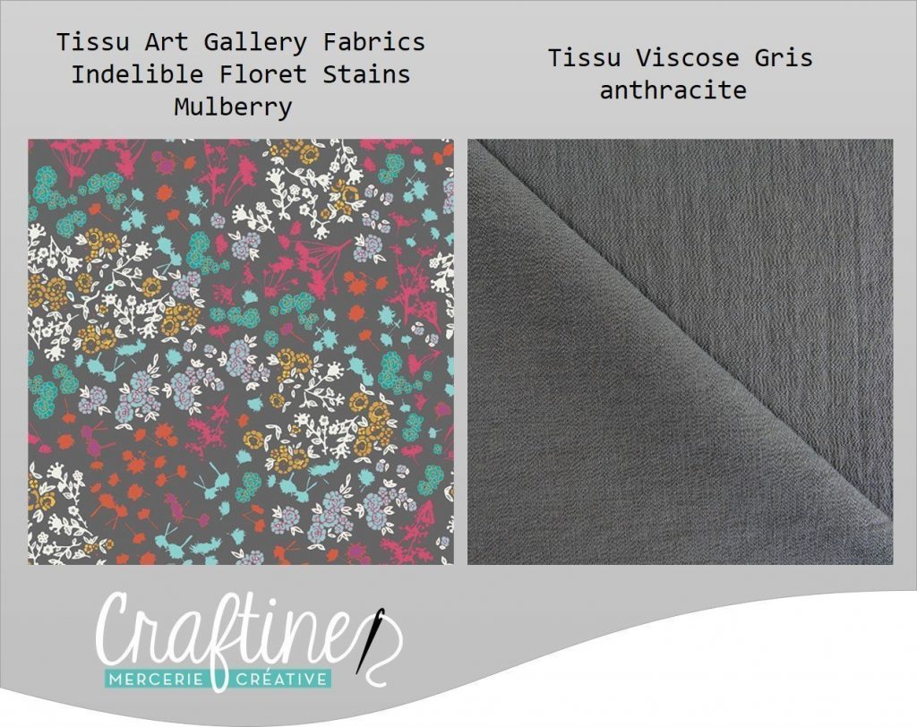 Pour réaliser ces robes, nous avons choisi de marier deux tissus, un superbe tissu coton de Art Gallery Indelible Floret Stains Mulberry avec un tissu viscose gris anthracite relativement épais qui a une belle tenue.