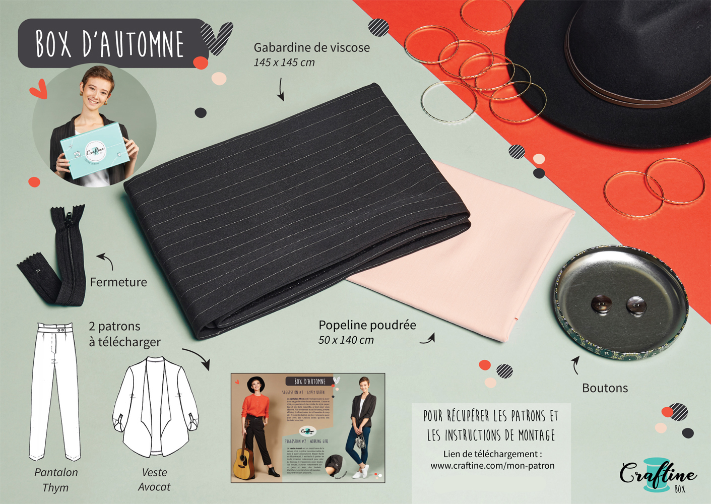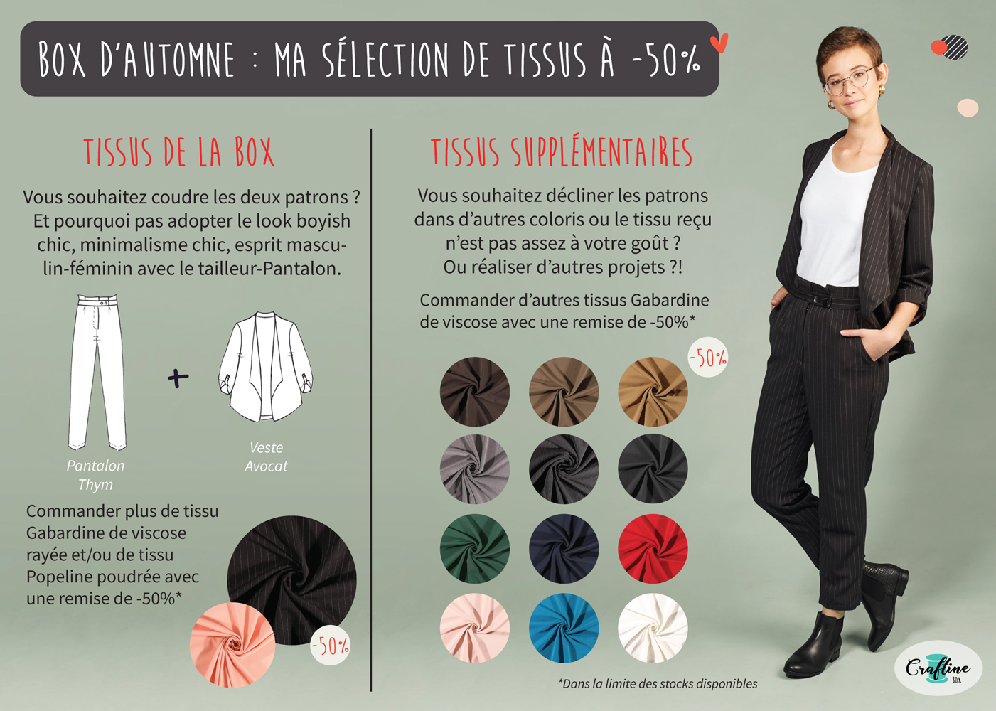 Pour adopter le look boyish avec le tailleur-pantalon ou pour coudre le pantalon Thym et la veste Avocat dans d’autres coloris, faites vous plaisir avec notre sélection de tissus Gabardine de viscose à prix coûtant : https://www.craftine.com/vpbox. Si votre abonnement est actif et que vous vous connectez avec votre compte Craftine Shop, une remise de 50% va être appliquée automatiquement à tous les tissus de la sélection. Si vous n’avez pas encore de compte Craftine Shop, créez-en un avec le même email que celui utilisé pour Craftine Box.