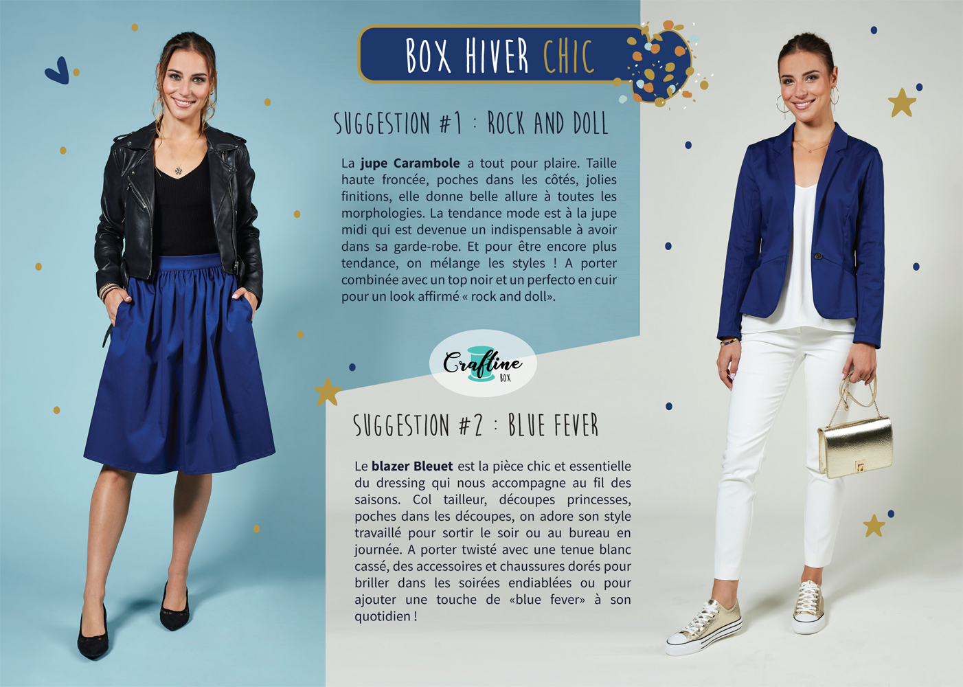 Voici la nouvelle Craftine Box Hiver chic avec de jolis couleurs et motifs, une belle matière satinée, associée à un imprimé parsemé de touches dorées pour un soupçon de brillant et le tour est joué ! Vous allez rayonner pour les fêtes de fin d’année mais aussi pour après ! Elle s’accompagne de deux nouveaux patrons couture en avant première et en exclusivité, des pièces modes et tendances du dressing. Nous vous avons préparé des tenues pour affirmer votre look. Rock and doll ou blue fever, vous allez illuminer les soirées endiablées et les journées au bureau ! Découvrez également un nouveau tuto inédit dédié pour la première fois… aux hommes. De quoi gâter un homme de votre entourage avec cet accessoire cool qui permet de se démarquer avec classe !