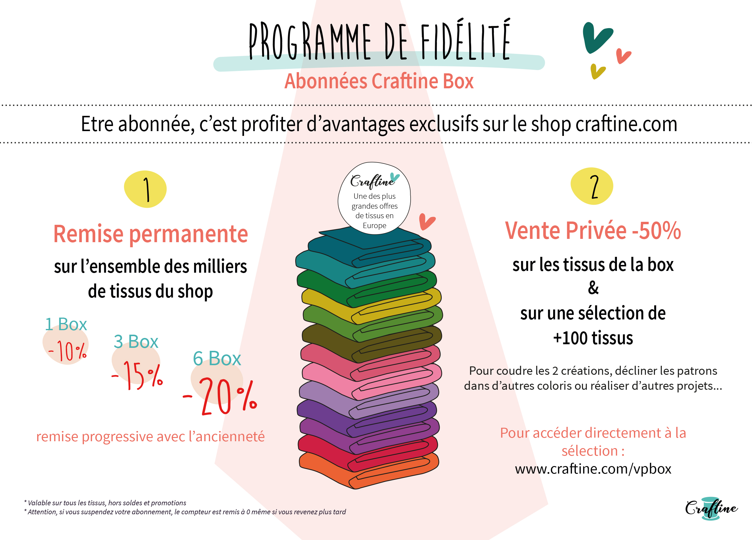 Si votre abonnement est actif et que vous vous connectez avec votre compte Craftine Shop, une remise de 50% va être appliquée automatiquement à tous les tissus de la sélection. Si vous n’avez pas encore de compte Craftine Shop, créez-en un avec le même email que celui utilisé pour Craftine Box.
