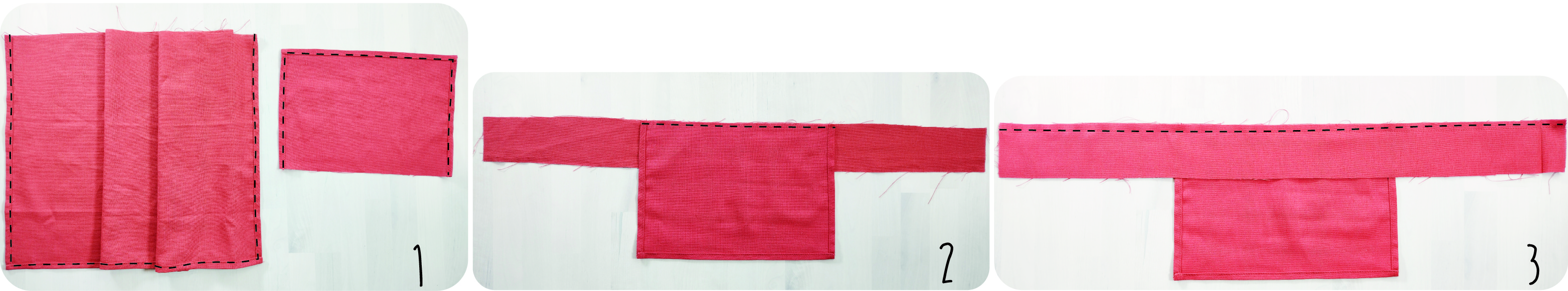 1- Ourler haut et côtés du haut du tablier. L’ourlet fini est de 7 mm. Ourler bas et côtés du bas du tablier. L’ourlet fini est de 7 mm.