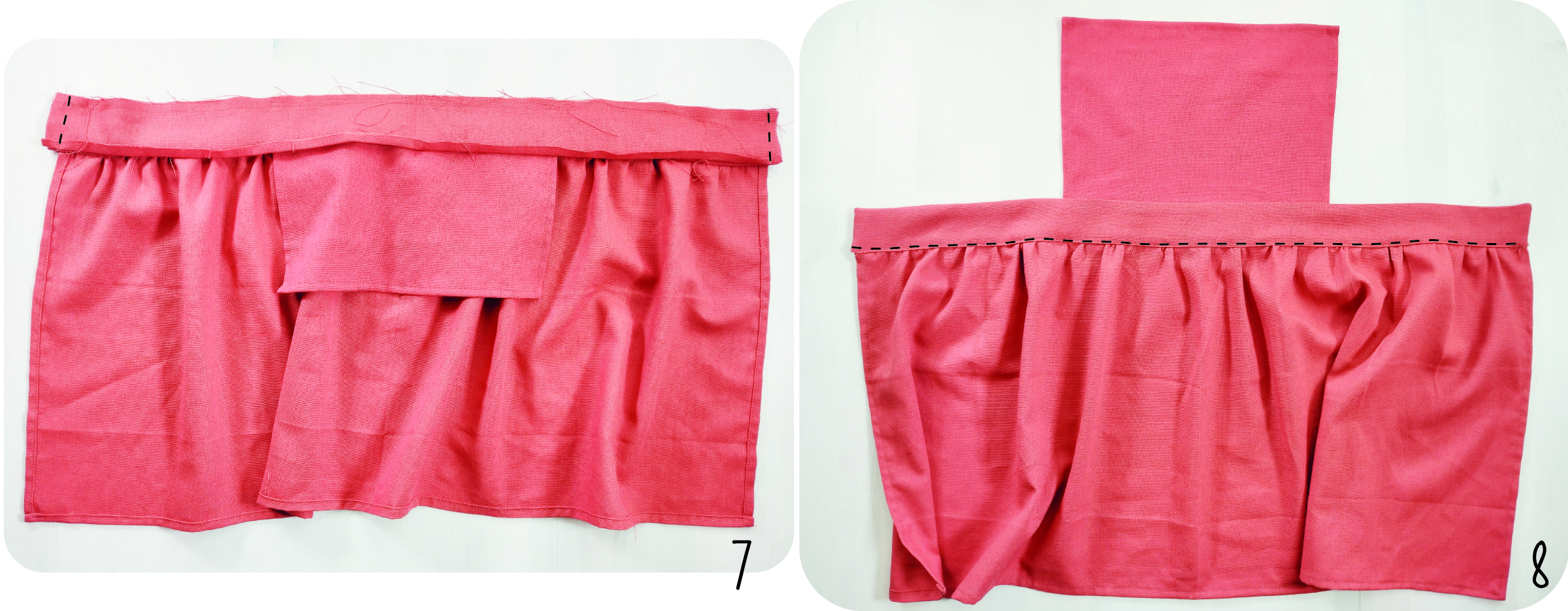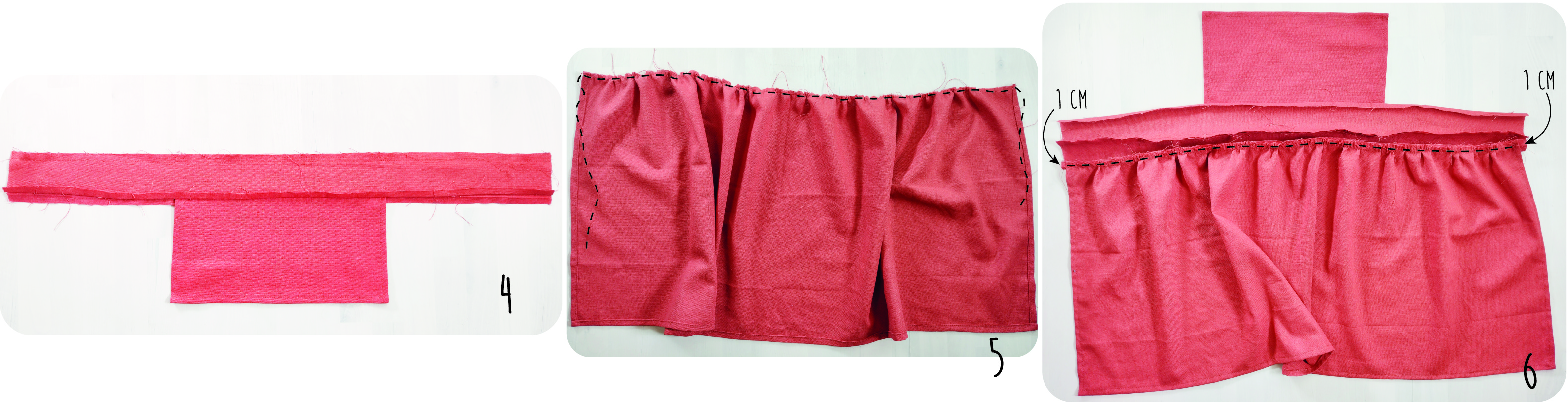 5- Froncer le haut du bas de tablier, de sorte qu’il corresponde à la largeur de la ceinture, moins 1 cm de marge de couture de chaque côté de la ceinture (soit 76 cm pour ce patron).