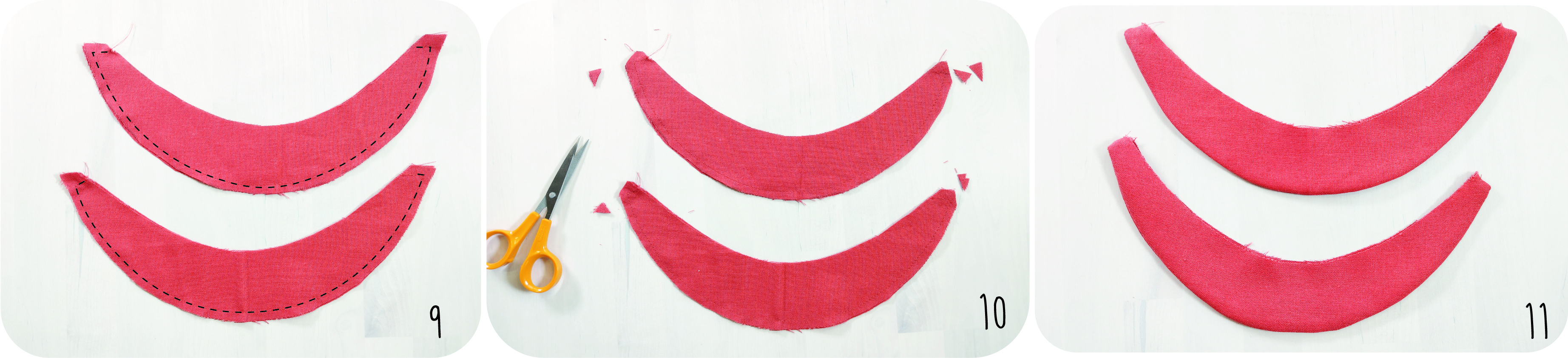 9-Réaliser les volants, pour cela superposer endroit contre endroit une paire de volant. Assembler les petits côtés et le côté extérieur à 0.5 cm du bord. Répéter cette étape avec l’autre paire.