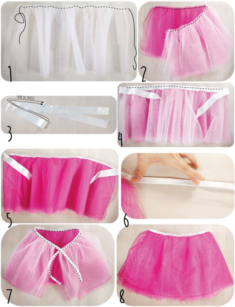 – Réaliser des fronces sur un des bords longs afin qu’une fois froncé, la bande ait la mesure du tour de taille. Répéter cette étape avec toutes les bandes de tulle.(Photo 1)