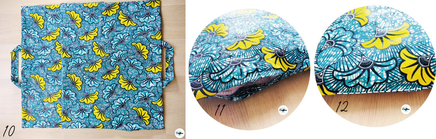 Retourner les poignées sur l’endroit puis faire basculer la couture d’assemblage pour la placer au milieu des poignées. (Photo 3)