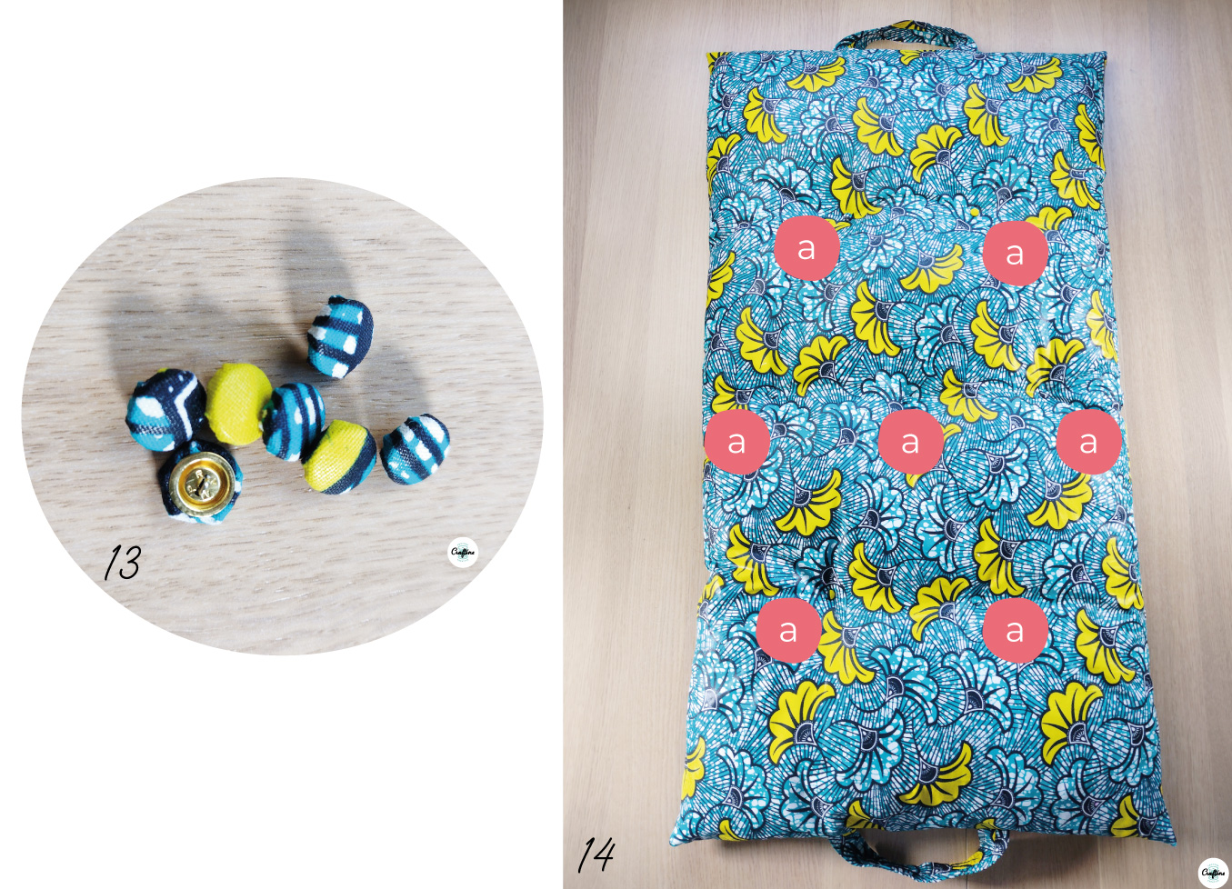5- Afin d’obtenir l’effet de capitonnage, poser des boutons en suivant les repères a. (Photo 13 & 14)
