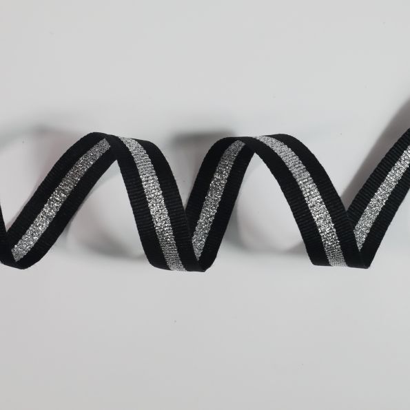 Ruban gros grain à rayures brillantes en lurex, solide et un peu raide. Légèrement côtelé et sans lisière. Vendu en bobine de 15 mm de largeur et d'une longueur de 4 mètres. Idéal en déco ou pour vos loisirs créatifs.