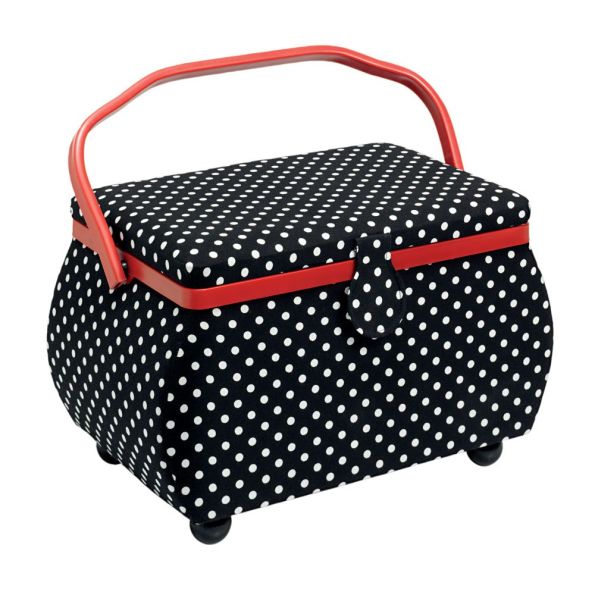 Cette boite à couture de grande taille séduit par sa simplicité d'utilisation. Ses nombreux espaces de rangement, offrent une place adaptée à tous les accessoires de couture. Bobines de fils, ciseaux, outils de traçage, chacun trouve sa place. Son design antique en tissu noir à pois blanc rembourré, assure une facilité de transport et une aisance d'utilisation pour mettre à disposition aiguilles ou épingles. Quatre pieds assurent une stabilité et une protection à ce coffret à ouvrage, faisant de lui le compagnon idéal pour la couture.