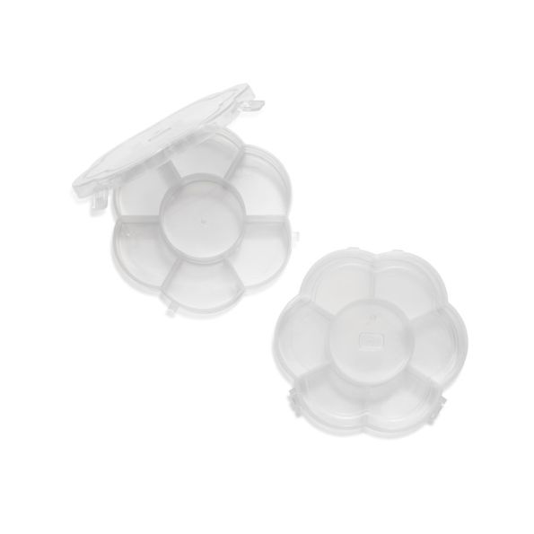 C’est précisément pendant la couture que diverses petites pièces s’accumulent rapidement. Si vous souhaitez les avoir facilement à portée de main, vous allez adorer cette boîte de rangement « Fleur » ! Elle est parfaitement adaptée pour ranger les boutons, œillets et autres petits accessoires – même les paquets mélangés, par exemple les Color Snaps, peuvent être rangés et triés par couleur. La boîte en plastique haut de gamme est pratique, refermable et composée de 7 compartiments. Elle peut être remplie comme souhaitée, en fonction du projet de couture, et réutilisée à tout moment. Sa forme de fleur apporte une touche printanière à votre table de couture.