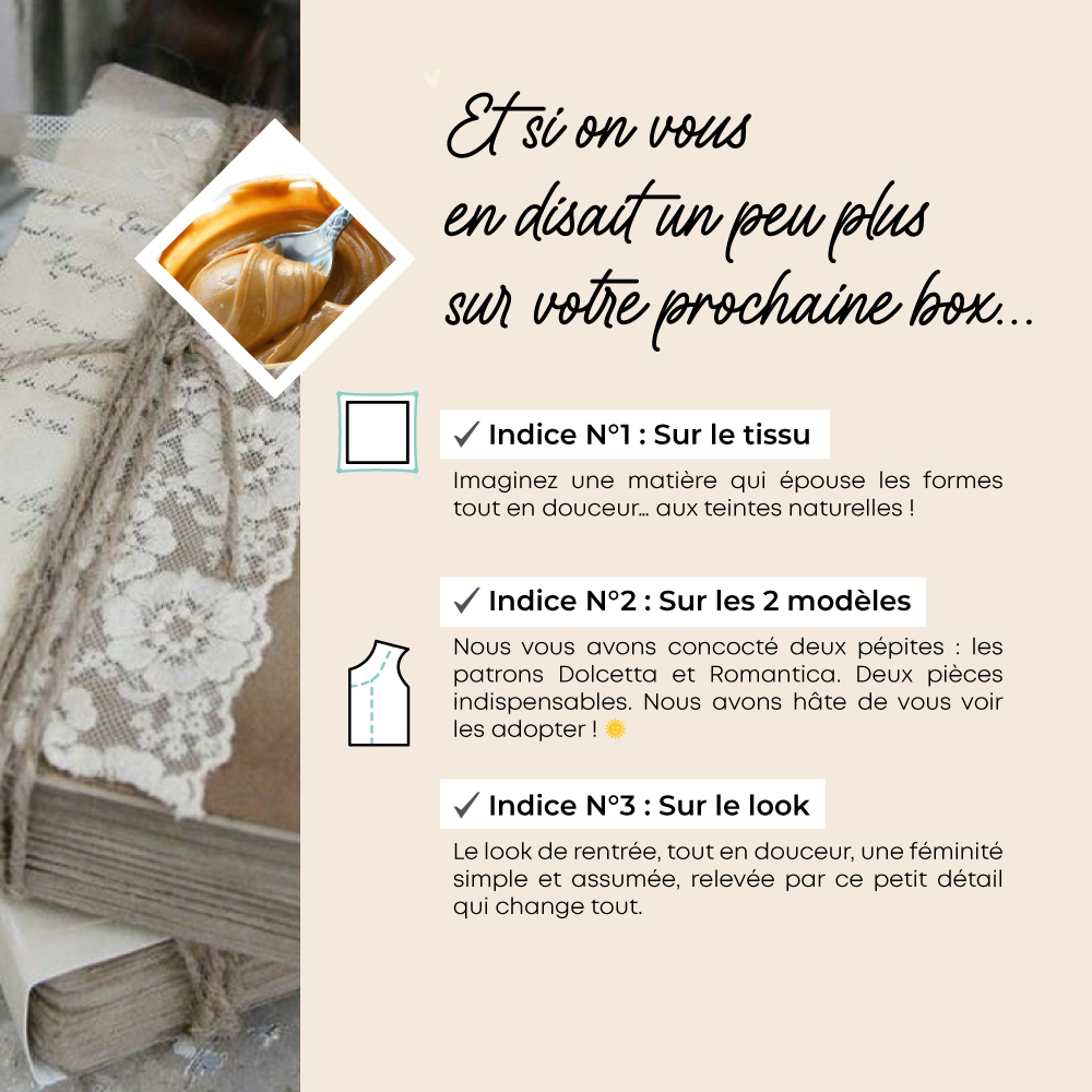 Mais ne vous inquiétez pas, nous vous dévoilons à chaque début de mois de sortie de notre box couture, quelques indices pour vous faire patienter.