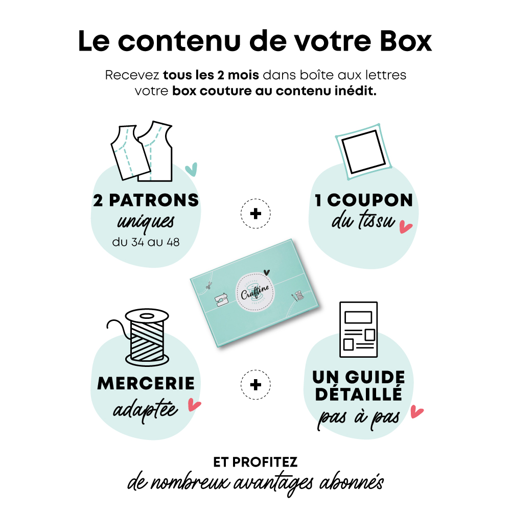 R1: La Craftine Box est une box de couture surprise que vous recevrez tous les deux mois directement dans votre boîte au lettre. Chaque box contient tout ce dont vous avez besoin pour créer un vêtement de femme complet à partir de deux patrons de couture.