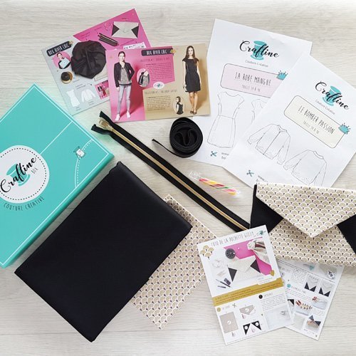 Tissus, mercerie, 2 patrons couture, gammes de montage détaillées, tutos surprises, des conseils de style. Un contenu complet et varié. Tout pour coudre un ou plusieurs vêtements mode femme ainsi que des accessoires.