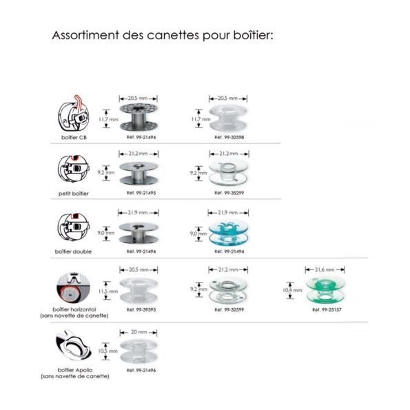 Les canettes machine à coudre Prym métal pour boîtier double sont adaptées aux machines à coudre possédant un boitier double. Ce type de boitier est notamment présent dans les machines à coudre PFAFF, MEISTER et autres avec capsule de cette forme typique. Ces canettes ont un diamètre de 21,9 mm pour une hauteur de 9,0 mm.