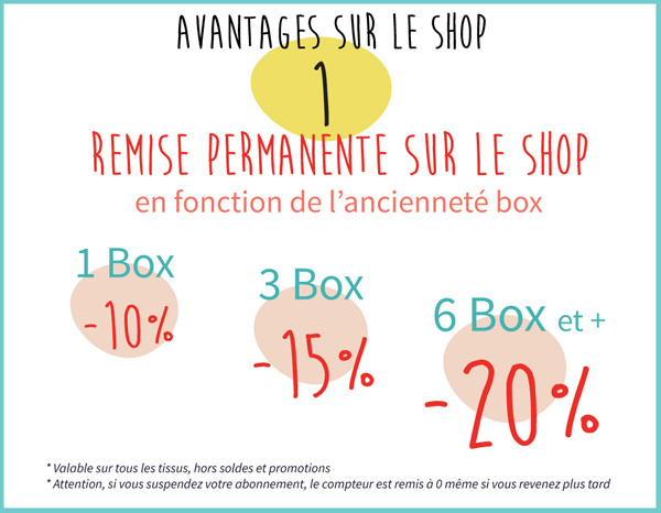 En étant abonnée à la Craftine Box, profitez d'une réduction exclusive permanente et illimitée sur la mercerie en ligne Craftine Shop en fonction de votre ancienneté.