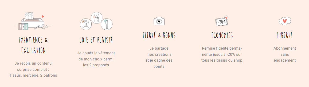 - une sélection de tissus à prix cassés à -50% après réception de chaque box.