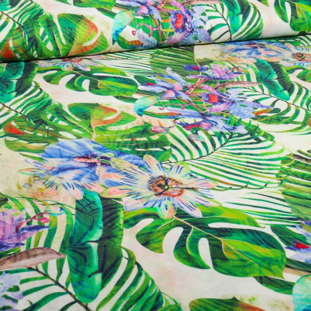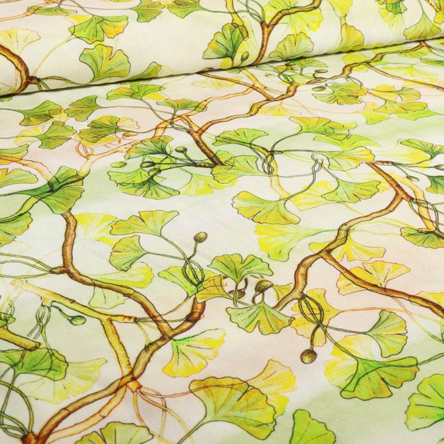 Prix Spécial 2,15 € Prix normal 2,39 €Tissu Jacquard Ginkgo graphique lurex sur fond écru - Par 10 cm