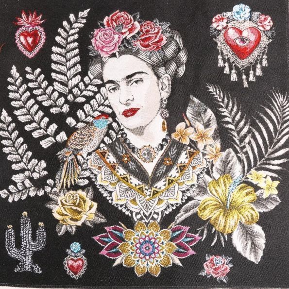 Panneau carré jacquard 48x48cm Frida Kahlo fleuris sur fond Noir