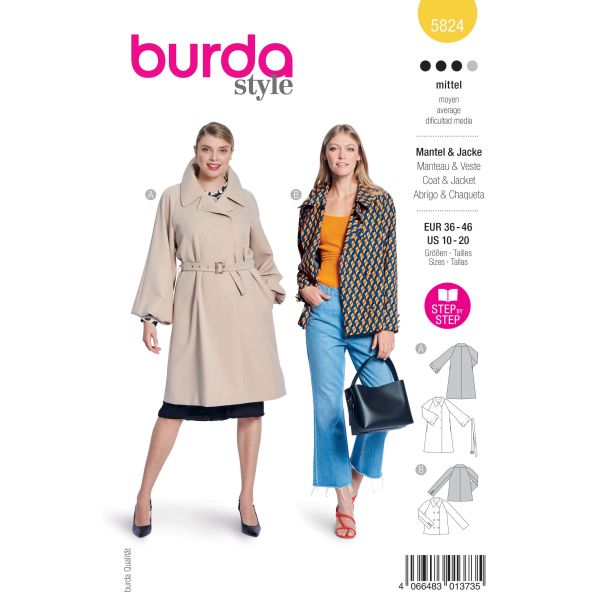 Super élégant et pourtant décontracté : Le manteau à la coupe décontractée s'adapte parfaitement à toutes les tenues et peut être facilement ajusté avec une ceinture. Le patron de la veste raffinée plus courte avec double patte de boutonnage devient une pièce préférée avec des boutons de style caban que l'on recouvre soi-même. Laisse-toi inspirer par nos patrons burda style !