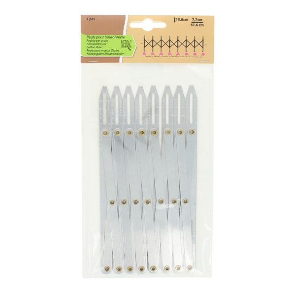 Cette règle pour boutonnière est un outil indispensable pour espacer régulièrement les boutons d'une boutonnière. Il vous suffit d'écarter la règle entre l'emplacement premier et dernier bouton et elle vous indique où placer les autres.