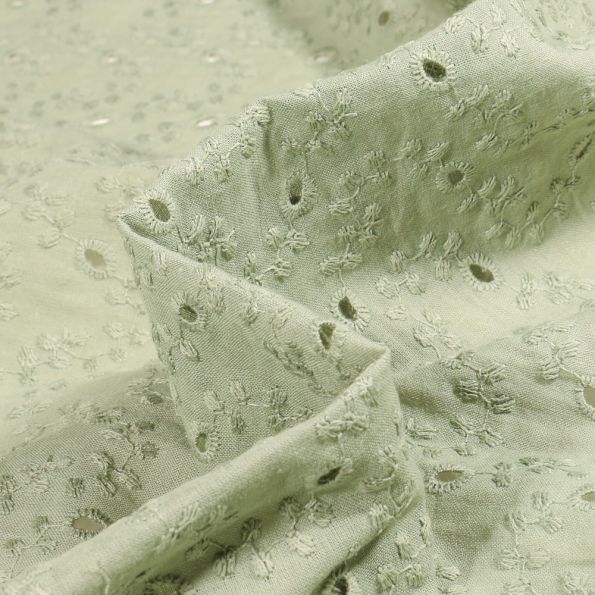 Tissu Broderie anglaise coton ajouré uni Andrea sur fond Vert pastel - Par 10 cm