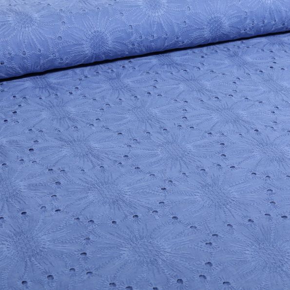Tissu Broderie anglaise Pâquerette sur fond Bleu indigo - Par 10 cm