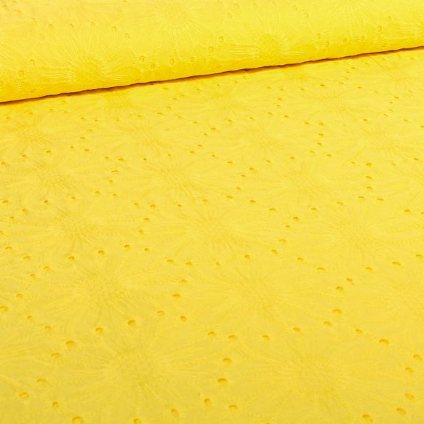 Tissu Broderie anglaise Pâquerette sur fond Jaune - Par 10 cm