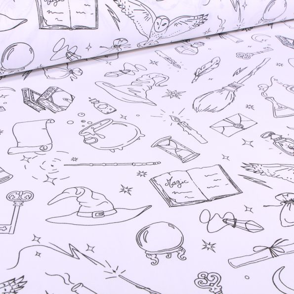 Tissu Coton à colorier Arty Sorcier sur fond Blanc - Par 10 cm