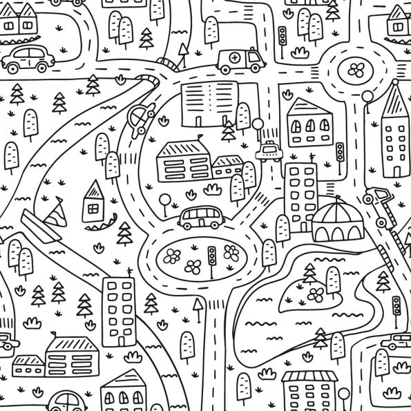 Tissu Coton à colorier Ville miniature sur fond Blanc - Par 10 cm