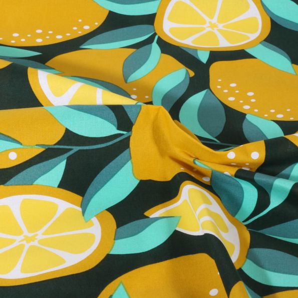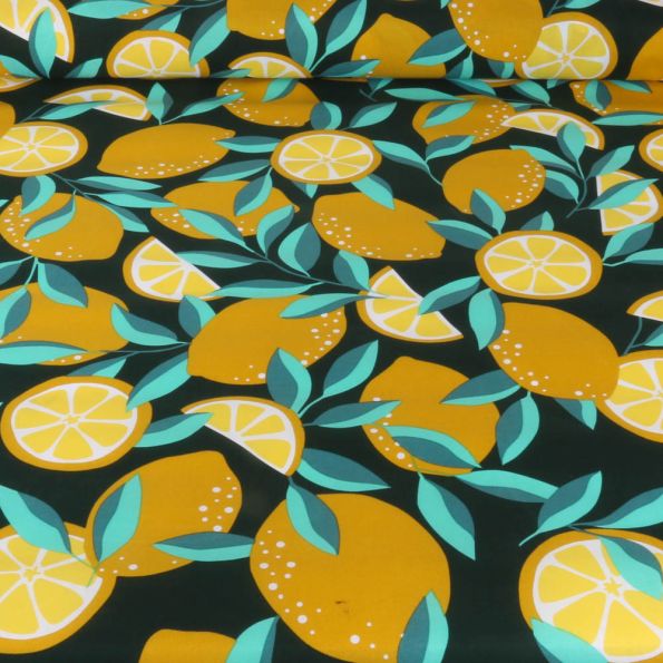 Tissu Coton Fruité citron sur fond Noir - Par 10 cm