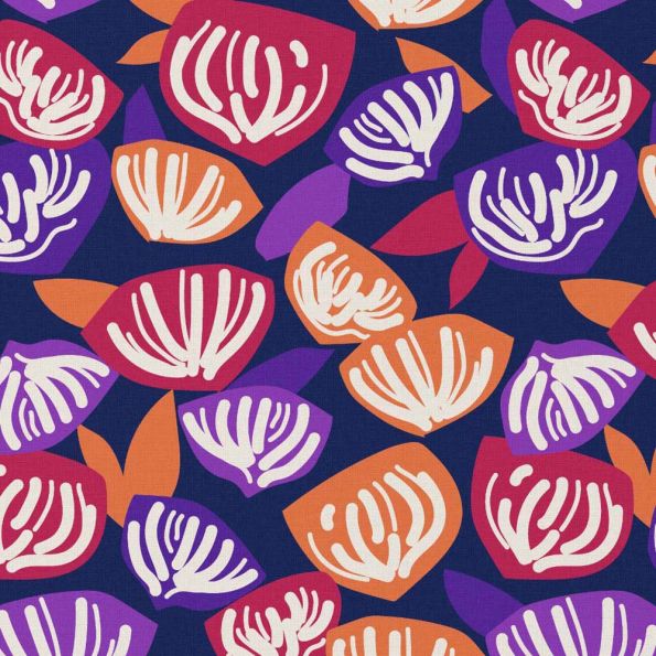 Tissu Coton enduit Kimso orange et violet sur fond Bleu marine - Par 10 cm