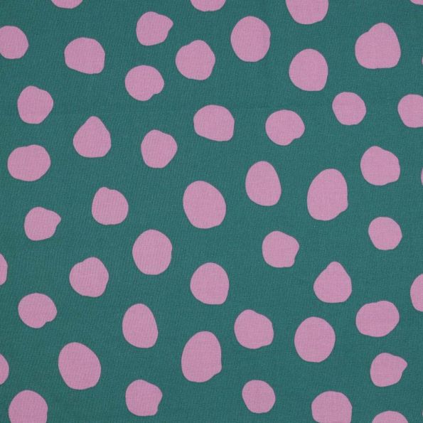 Tissu Coton enduit Pois roses sur fond Vert émeraude - Par 10 cm
