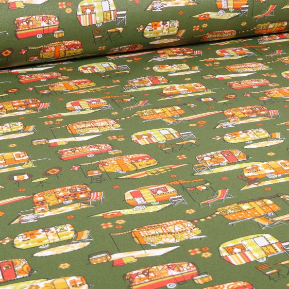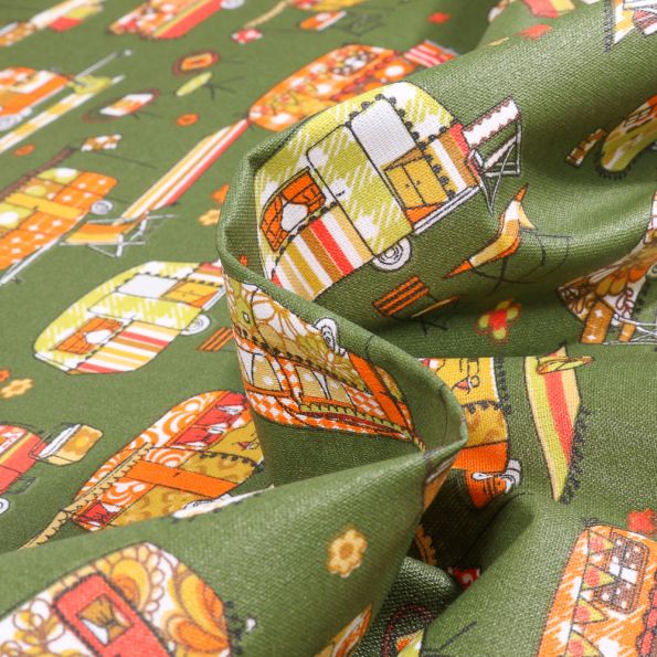 Tissu Coton enduit Road trip Van sur fond Vert kaki - Par 10 cm