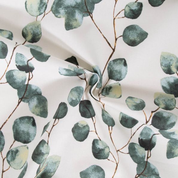 Tissu Coton Enduit Semi Panama Eucalyptus sur fond Ecru - Par 10 cm