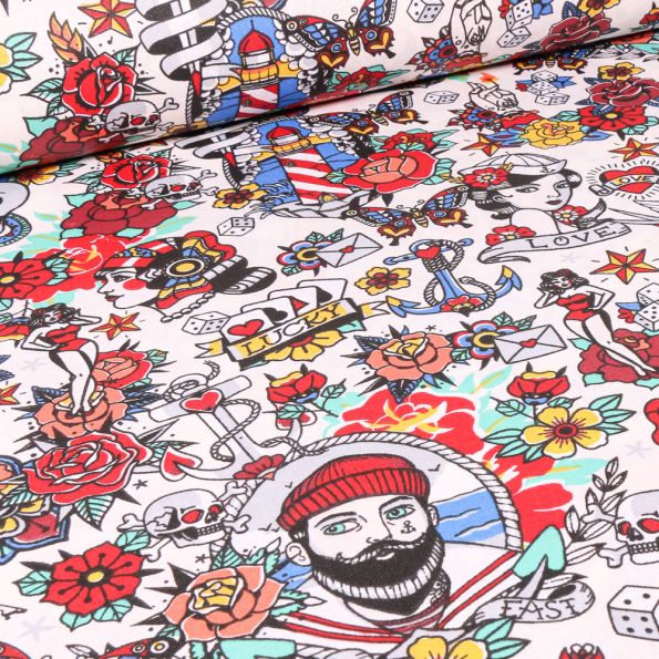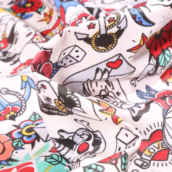 Tissu Coton enduit Tattoo sur fond Blanc - Par 10 cm