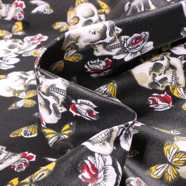 Tissu Coton enduit Têtes de mort et papillons sur fond Noir - Par 10 cm