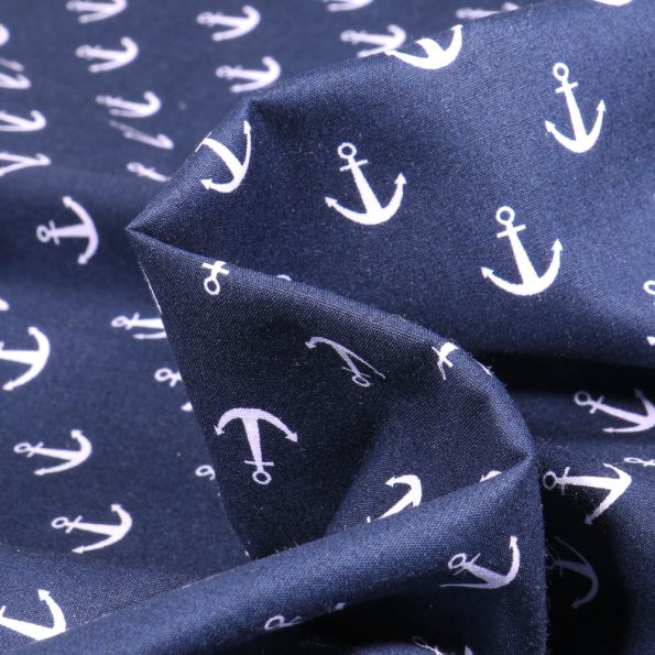 Tissu Coton imprimé Ancre marine 1.5 cm sur fond Bleu marine - Par 10 cm