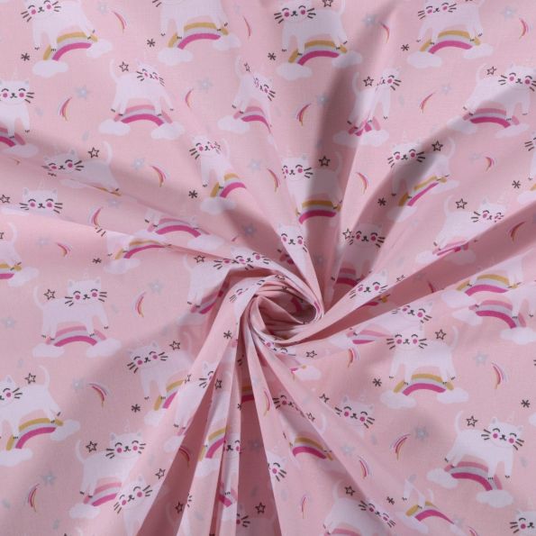 Tissu Coton imprimé Arty Chats et arc en ciel sur fond Rose - Par 10 cm