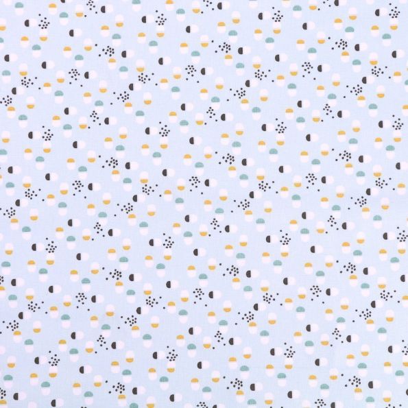 Tissu Coton Imprimé Arty Motifs Moutarde, bleus et blancs sur fond Bleu ciel - Par 10 cm