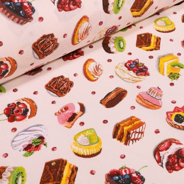 Tissu Coton imprimé Arty Pâtisserie sur fond Beige - Par 10 cm