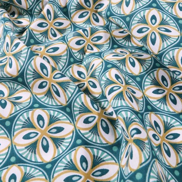 Tissu Coton imprimé Arty Rosaces ocres et bleu pétrole sur fond Bleu - Par 10 cm