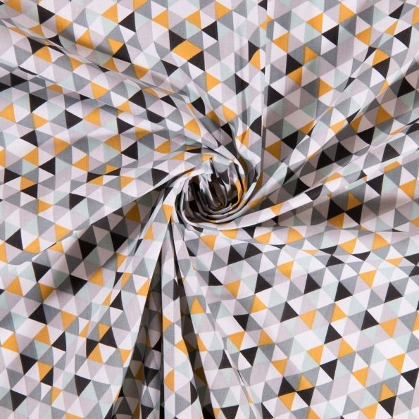 Tissu Coton Imprimé Arty Triangles Jaunes, Gris et noirs sur fond Blanc - Par 10 cm