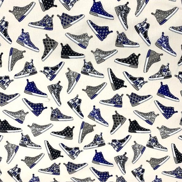 Tissu Coton imprimé baskets bleues sur fond Ecru - Par 10 cm